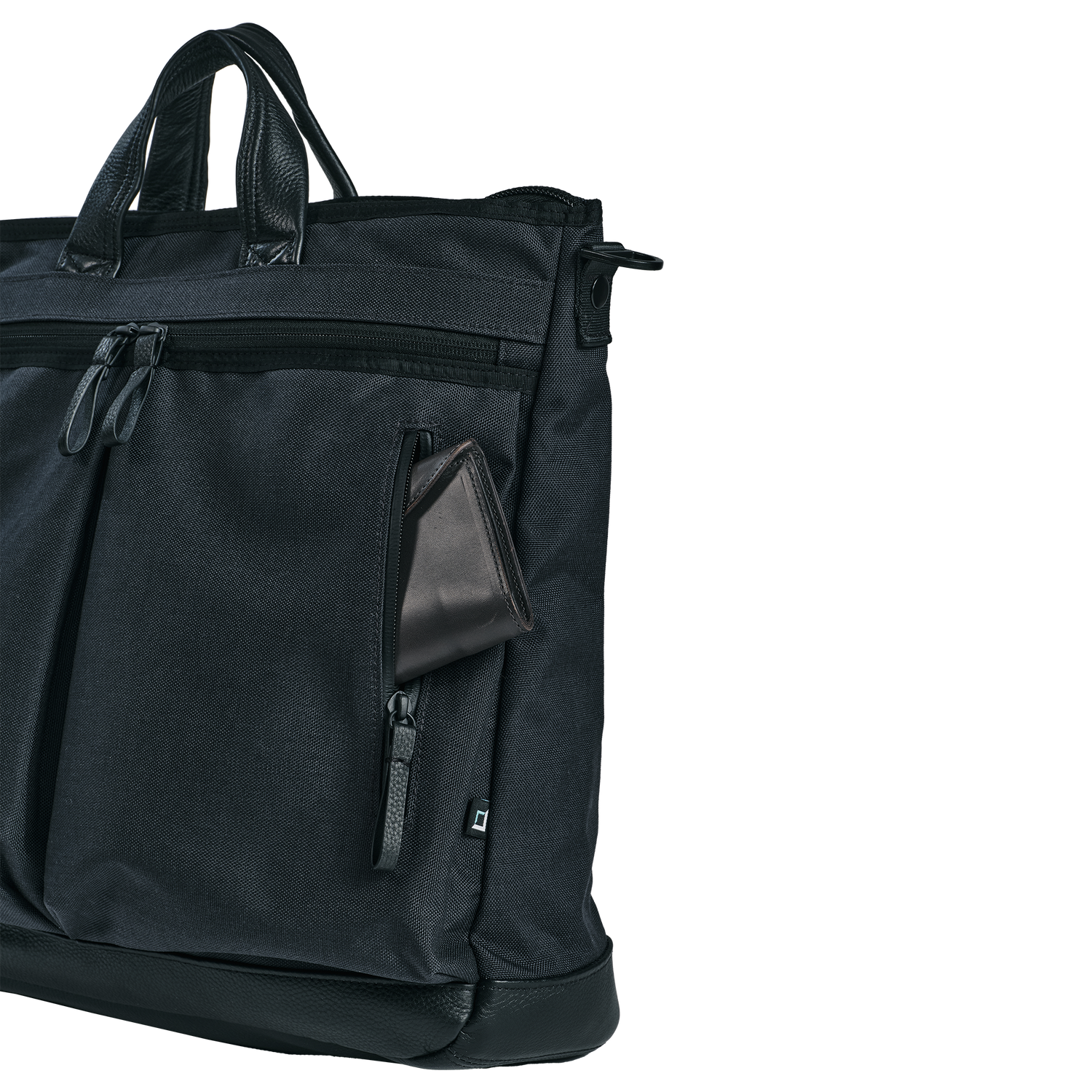 フロントユーティリティポケットローには止水ファスナー、フロントユーティリティポケットカラムはYKKファスナー裏使い。引き手にはトップハンドルと底面と共通のシボのある牛革を使用。